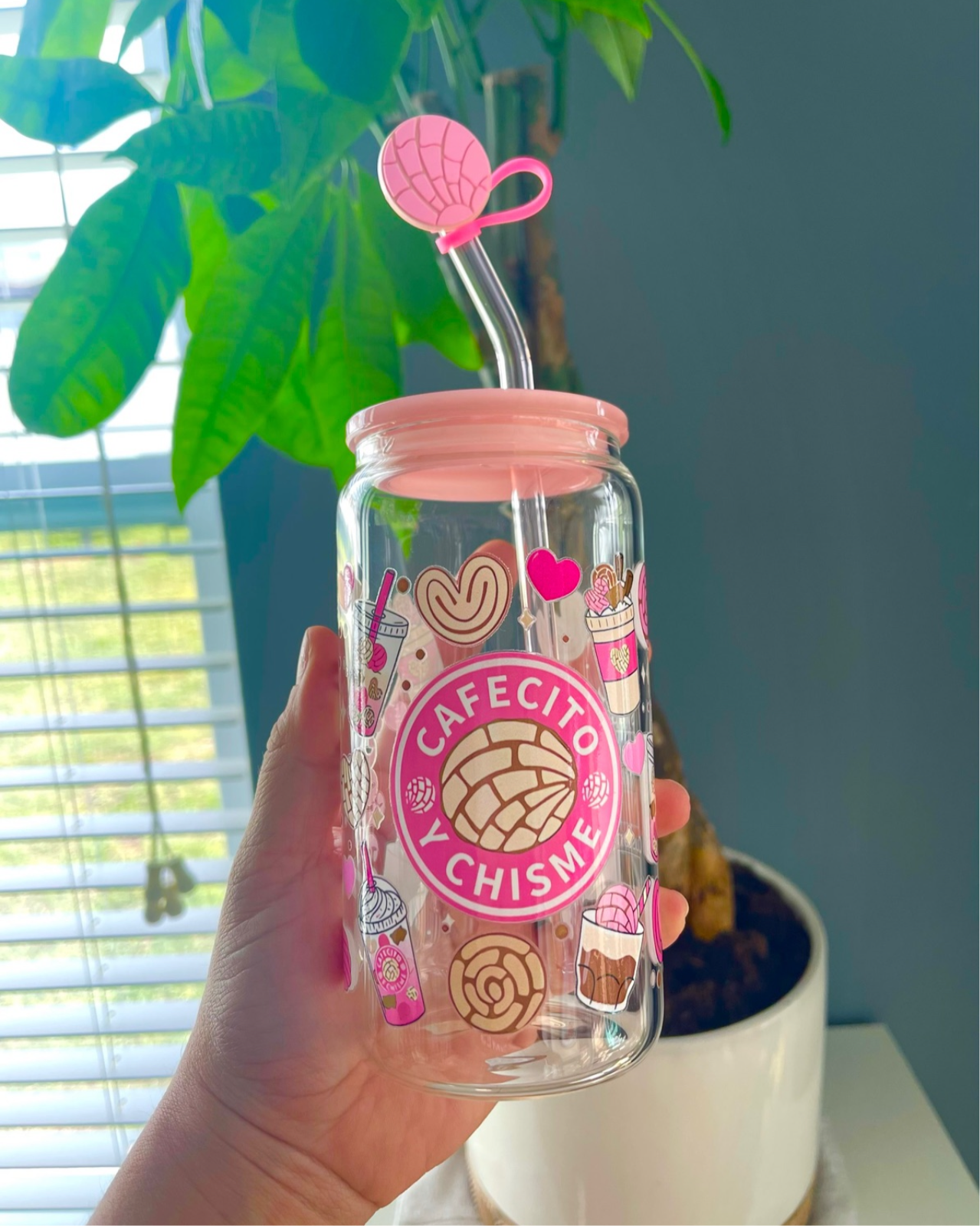 16oz Glass cup with acrylic Lid and Glass straw.